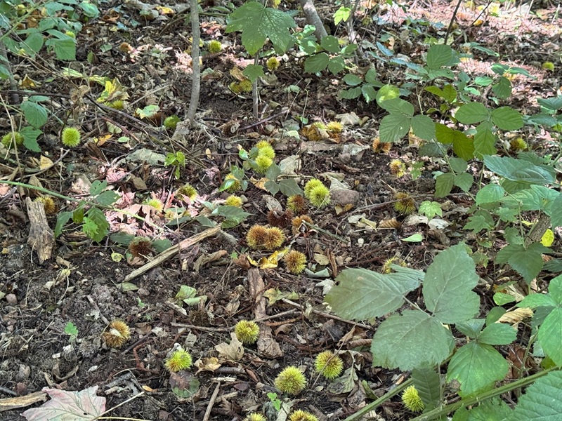 Der Weg dorthin führt durch goldene Kastanienhaine, in denen das Sammeln zur meditativen Waldtherapie wird. Aber uffbasse! Wir sind schon das eine oder andere Mal von herabfallenden Kastanien getroffen worden… Es sind schon echt viele!